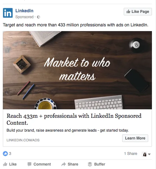 For example, LinkedIn’s ad announces that over 433 professionals have accounts on their platform.