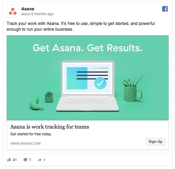Creating a Facebook ad design that looks trustworthy and outstanding isn’t too difficult. You don’t need the black belt in Photoshop to put together a simple well-designed Facebook ad. For example, Asana’s ads are simple, yet they look stunning: