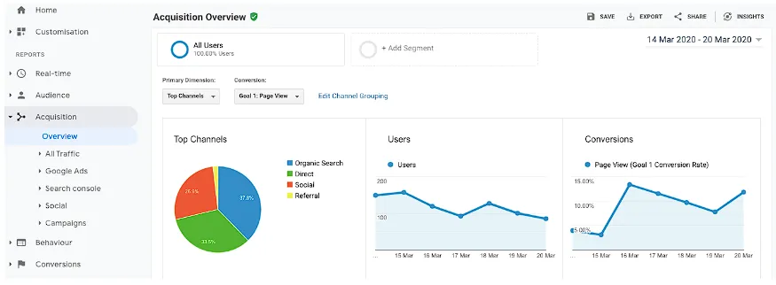 Go to the GA dashboard, navigate to "Acquisition" in the left menu, and click "Overview."
