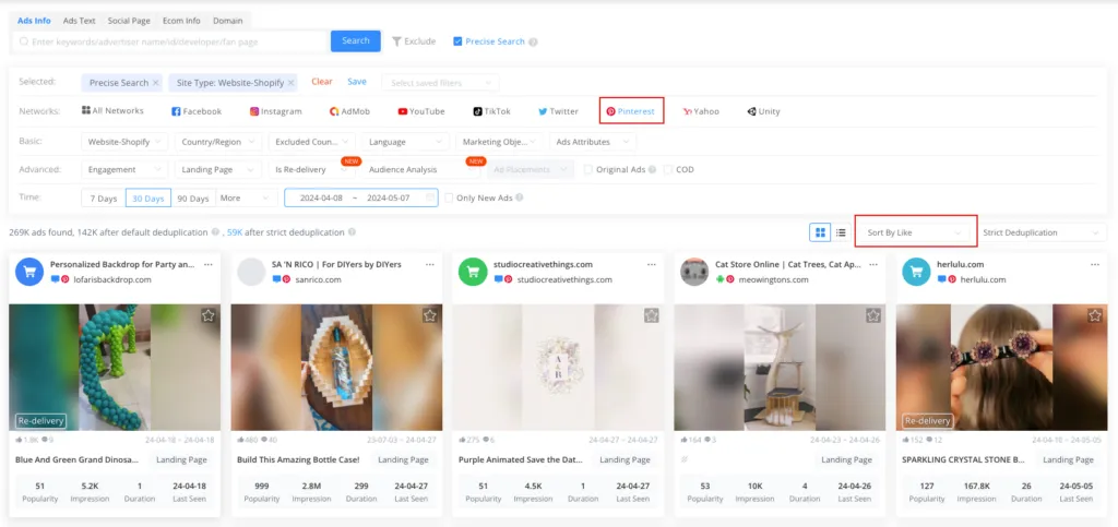 On BigSpy, you can select Pinterest and sort by likes for a short period, allowing you to filter results for products that are popular on Pinterest in the short term.
