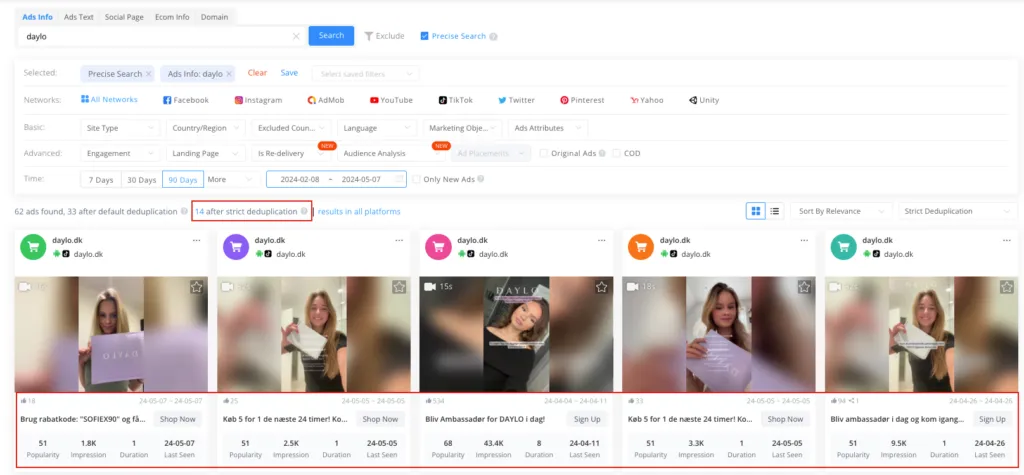 Furthermore, if you want to quickly understand what products your competitors are heavily promoting and how those products are performing, I would directly recommend you search for your competitors' website names on BigSpy, as shown below. The search results are all the ads placed by this website, not only clearly understanding what the core products of this website are, but also for the data-good materials, you can analyze the advertising creative itself and the time period of the placement to optimize your product placement strategy.