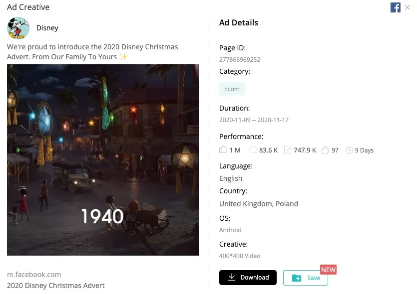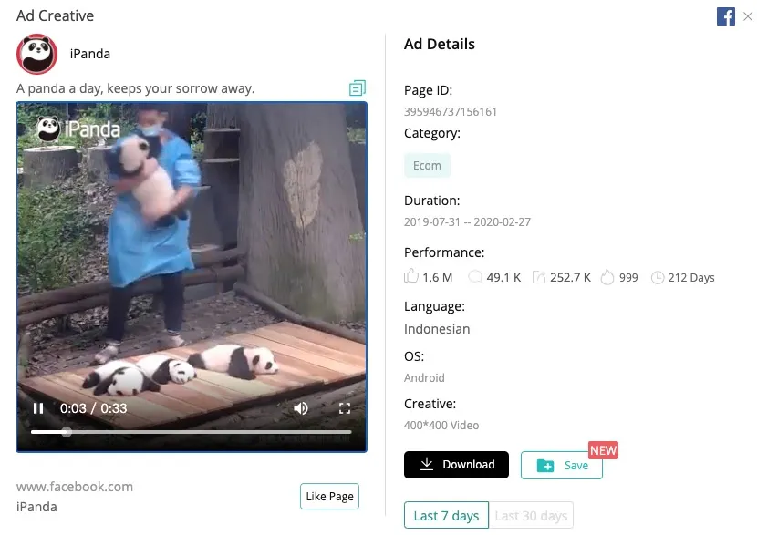 The giant panda is a national treasure of China, but it seems to be loved by people all over the world. This Facebook ad is just a video of 4 pandas sleeping, which lasts only 33 seconds and has 1.6M likes. No one can resist the cuteness of animals!