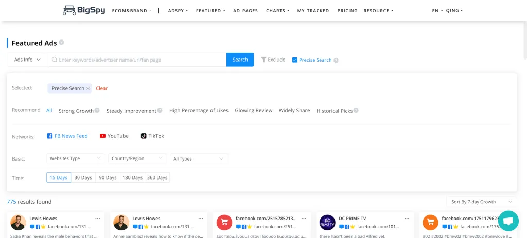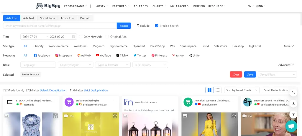 Open the adspy section of the BigSpy website, select the social media channels you need, and you can see a variety of search and filtering options at the top of the page.