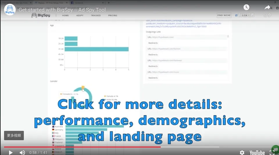 BigSpy's analysis function is a major feature of it. After you find the ad you want, click "detailed" in the upper right corner of the ad, or click the creative to see the detailed ad analysis. BigSpy tracks the seven elements of this ad.