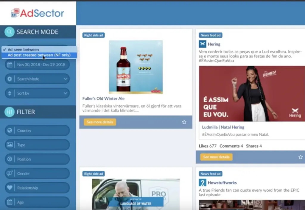 Adsector can search for ads on Facebook, and the ad database contains a total of 1.3 million ads. Users can find advertisements in the last 30 days on Adsector.