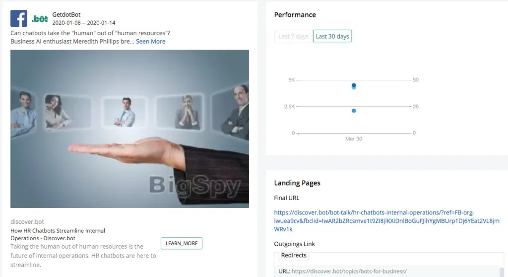 GetdotBot posted an advertisement on Facebook with the content: Can chatbots take the "human" out of "human resources"?. GetdotBot's ad from January 8 to 14, 2020, received 4.3k likes in 7 days. GetdotBot has developed a bot dedicated to chat, which for enterprises is to fully grasp the pain points of users. A lot of human resources of enterprises are wasted in communication, and chatbots help enterprises solve this problem.