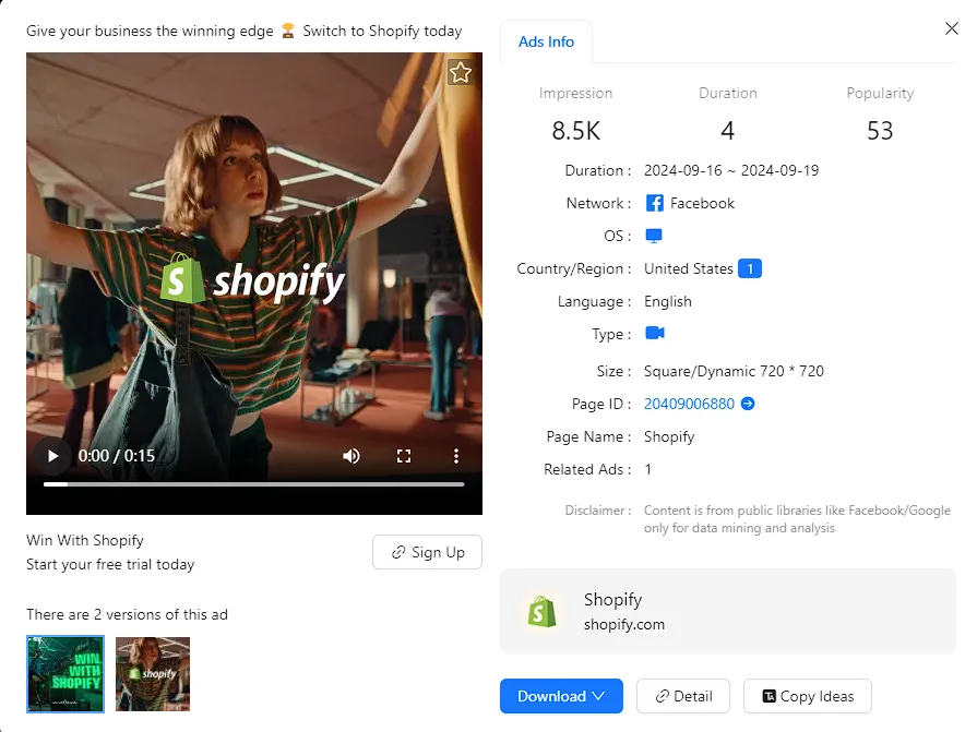 Case: Shopify has been running a branding video on Facebook since 2018. The video shows that more and more people are using Shopify to shop, with faster shipping and more convenient product selection.
