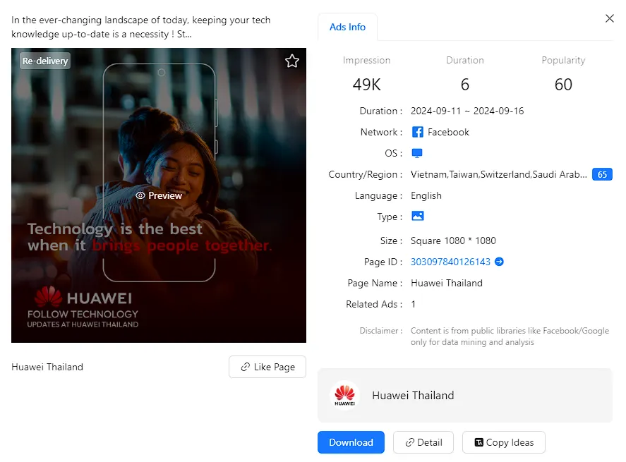 Searching for "Huawei" in BigSpy's Facebook ad library, we can see a large number of third-party promotions.E.g: