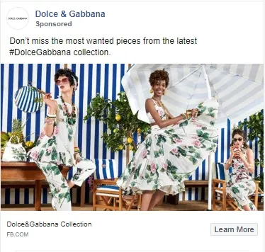 We have completed the list of Facebook clothing advertisement examples with this beautiful picture of Dolce & Gabbana. I like their trailer "Don't miss the most wanted work…". I don't know exactly which pieces they are referring to, but this will definitely arouse my curiosity. In any case, this may be their goal!