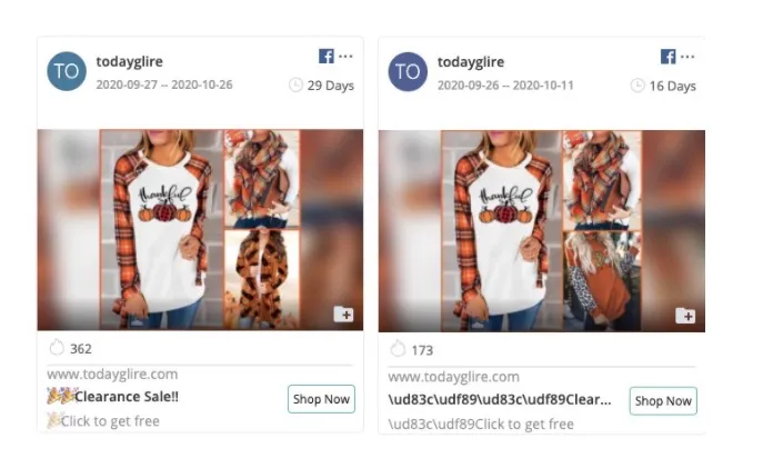 But if your audience is young people, or even millennials, the naughty and cute emojis are a direct way to impress them and will effectively increase the engagement rate. This is a comparison of Facebook brand advertisements from BigSpy. We can see that adding emojis to the ad headline and text makes the ad popularity 189 higher.