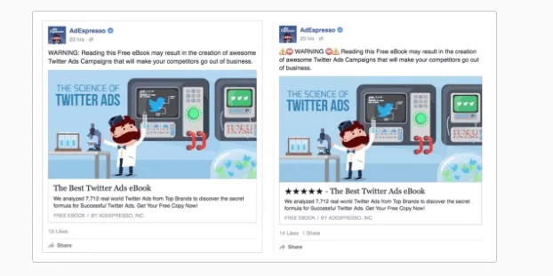 Have you ever wondered the difference between using emojis and not using emojis in Facebook ad copy? The AdEspresso team did this test. They used the A/B test to post 2 ads on Facebook, the others remained the same, only emojis were added to the copy of one ad. As a result, the click-through rate of ads with emojis increased by 12%.