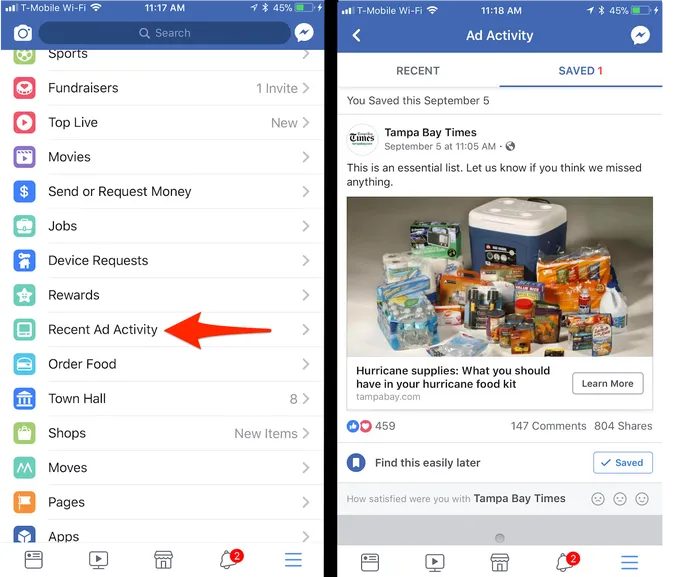 I don’t know if you have noticed that there is a "Recent Ad Activity" function in Facebook on your mobile phone. The "Recent Ad Activity" seems to show the ads you have clicked, liked, commented or shared in the past three months. There is also a label for ads that you save purposefully.