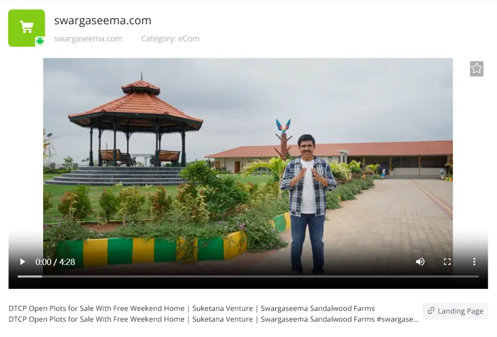 Case study: The advertisement for Swargaseema Sandalwood Farms effectively showcases its DTCP-approved open plots and provides a detailed introduction to the Suketana Venture, located in Cherukupally, Kondurg. By using a video format, the ad offers a comprehensive view of the plots' layout and surroundings, giving potential customers a clear overview of the project. The detailed narration not only enhances the transparency of the information but also helps viewers understand the project's benefits and potential. The promise of additional amenities, such as the construction of a resort, further boosts the project's appeal, addressing customers' expectations for future value and recreational facilities. Furthermore, the ad’s success is evident from the 22.8k likes it received shortly after publication, demonstrating its strong market impact and effective marketing. The clear contact information provided facilitates quick customer action, driving sales opportunities. Overall, this advertisement effectively captures attention and strengthens the project’s market competitiveness through efficient information delivery and value-added promises.