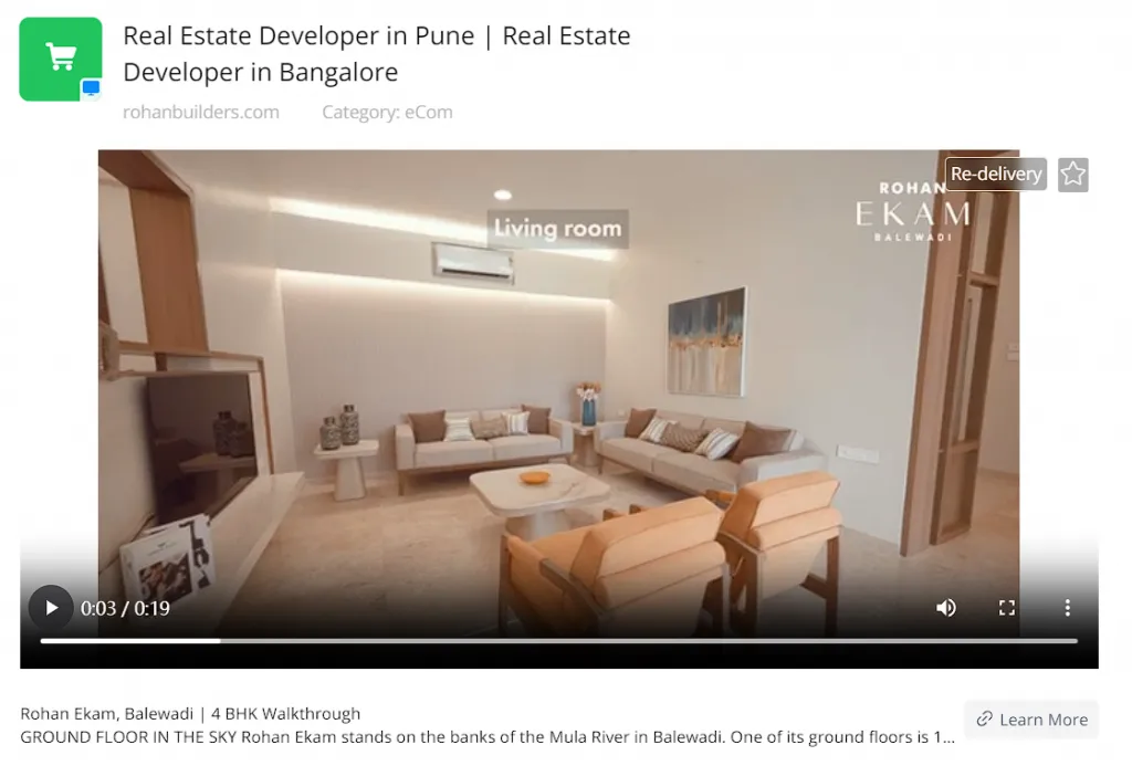Case study: The advertisement for Rohan Ekam uses innovative 3D surround video to showcase the layout of each room, offering an immersive visual experience. This presentation method takes viewers on a virtual tour, allowing them to fully experience the design and layout of each room as if they were physically present in the property. This high-tech approach not only enhances the interactivity and appeal of the ad but also effectively highlights the project's details and unique features. A key highlight of the ad is its creative concept of the "ground floor in the sky," which emphasizes the project’s unique selling point. Although the floor is actually 14 stories above ground, it still features greenery and amenities typically found on a ground floor. This inventive description piques viewers' curiosity and interest, making the ad more compelling. Additionally, by clearly showcasing room layouts and facilities, the ad deepens viewers' understanding of the project, thereby increasing potential buyers' interest.