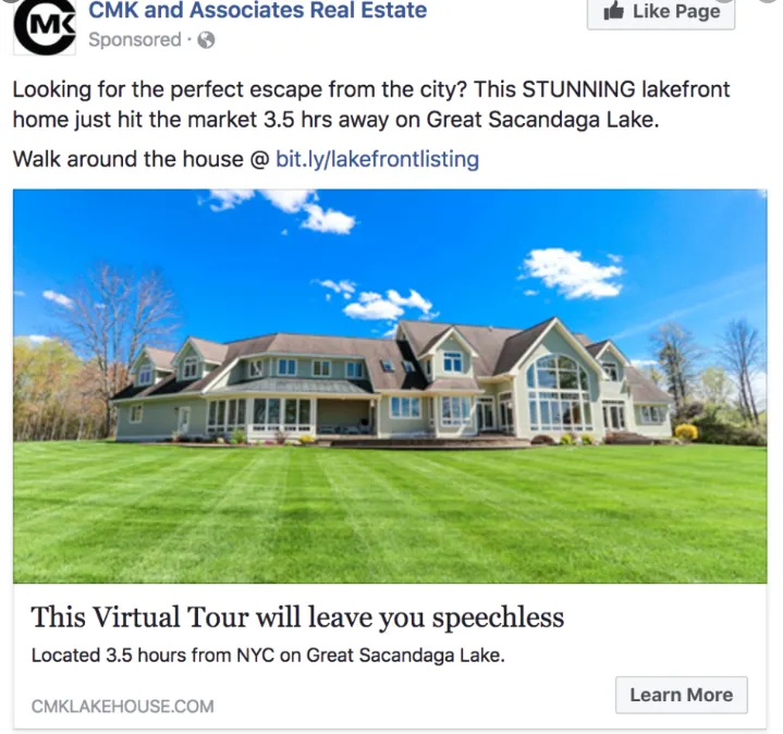 Case study: This advertisement effectively highlights the unique selling points of the property by showcasing a beautiful image of the residence. The picture features a stunning lakefront home set against a picturesque backdrop, presenting an idyllic lakeside lifestyle. The distinctive design and elegant style of the home are prominently displayed, making it visually captivating. This combination of a beautiful natural setting and unique architecture emphasizes the property's exclusivity and conveys a sense of luxury and comfort. By leveraging the appealing natural environment and the home's distinctive appearance, the ad successfully captures potential buyers' interest. The high-quality image allows viewers to clearly see the home's beautiful scenery and design details, which helps to increase their interest and desire for the property. Additionally, the ad includes a link to a detailed page where interested buyers can find more information. Overall, this advertisement effectively highlights the property's key features and successfully attracts the attention of potential customers through its exquisite imagery and detailed description.